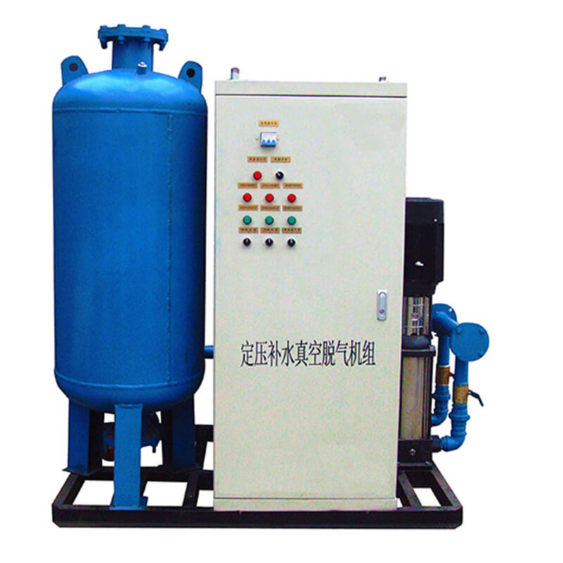 定压补水脱气机组是我公司采用先进技术研发的实现集中供热及空调系统定压、膨胀、补水、真空脱气四位一体的新型设备。该设备在系统中起到稳压、自动补水、膨胀自动泄水,脱除系统内游离气体及溶解气体等作用。使系统始终处于环保、节能的运动状态。 该装置利用气压罐的可调节能力,可自动调节用户水量的变化,当用水量减少或不用水时,可较长时间不启动水泵,达到节能目的。 与水塔、高位水箱相比可节省投资约40%—60%。该设备结构紧凑,与其他传统的供水装置相比减少了占地面积, 节省了土地资源。本设备全自动运行,无需专人管理,工作可靠。